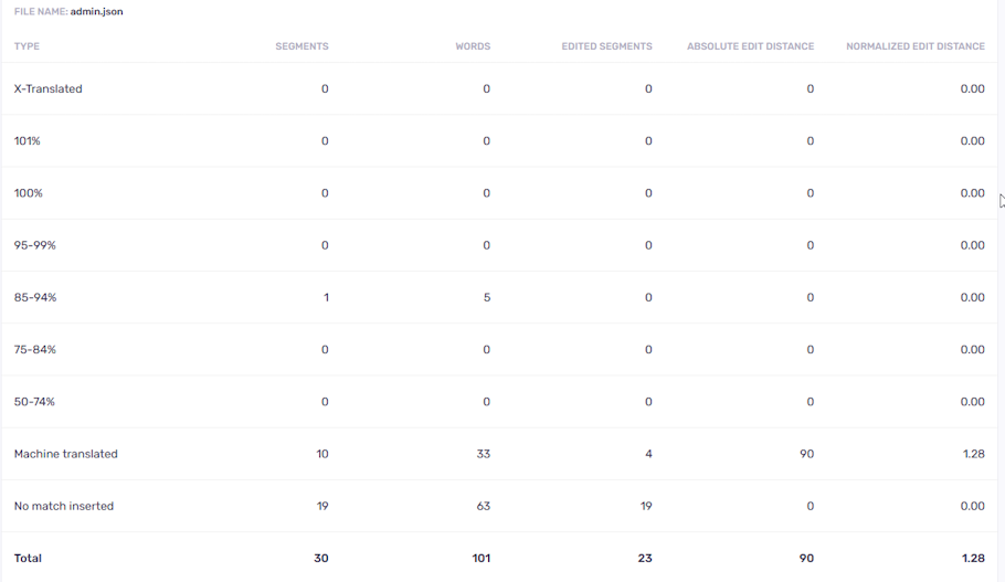 Check the Show results for each file checkbox to create a separate report for each file you have in the project. Created reports are more detailed and show all the edit distance scores by type (e.g., X-Translated, No match inserted, Machine translated etc.)