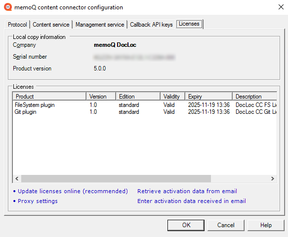 Klicken Sie im Fenster memoQ content connector configuration auf die Registerkarte Licenses.