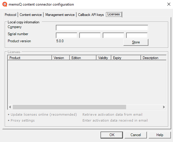 Bevor Sie memoQ content connector zum ersten Mal starten, müssen Sie es aktivieren. Dazu benötigen Sie eine Seriennummer und eine content connector-Lizenz. Um diese zu erhalten, wenden Sie sich an den memoQ-Vertrieb.