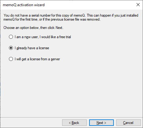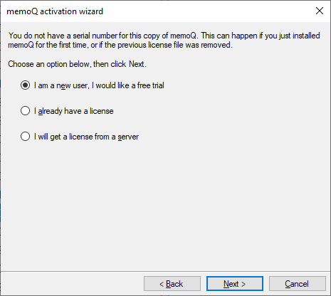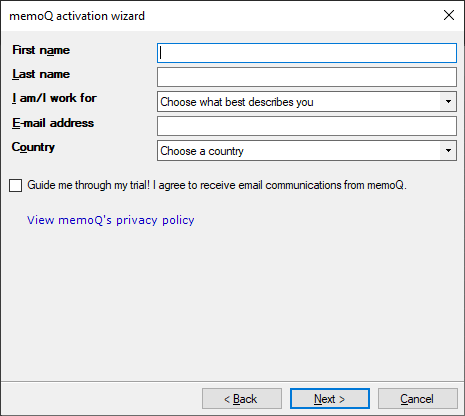 Wenn Sie memoQ starten und keine aktiven Lizenzen besitzen, wird der memoQ-Aktivierungsassistent automatisch gestartet.