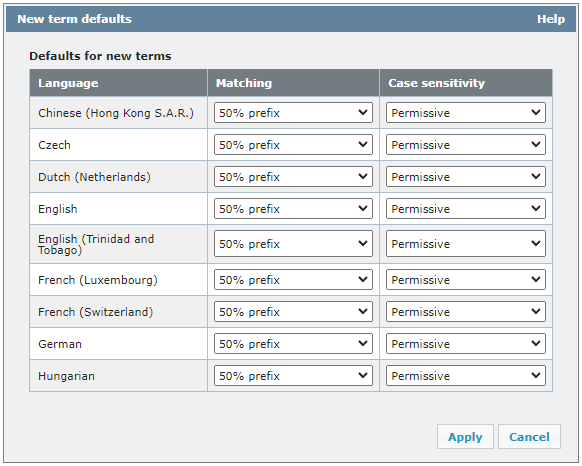 Konfigurieren Sie Übereinstimmung und Groß-/Kleinschreibung separat für jede Sprache in der Termdatenbank. Um mehr über diese Einstellungen zu erfahren, siehe den Termdatenbank-Eintrag bearbeiten.