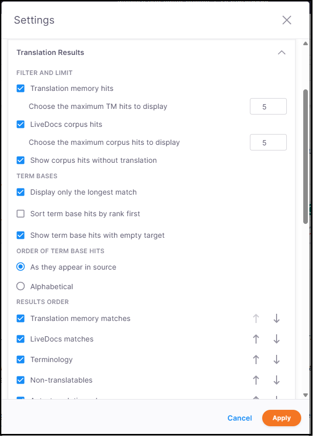 Im Abschnitt Reihenfolge der Ergebnisse können Sie die Reihenfolge der Ergebnisse (TMs, LiveDocs, Terminologie usw.) mithilfe von Kontrollkästchen und Sortierpfeilen sortieren und anpassen.