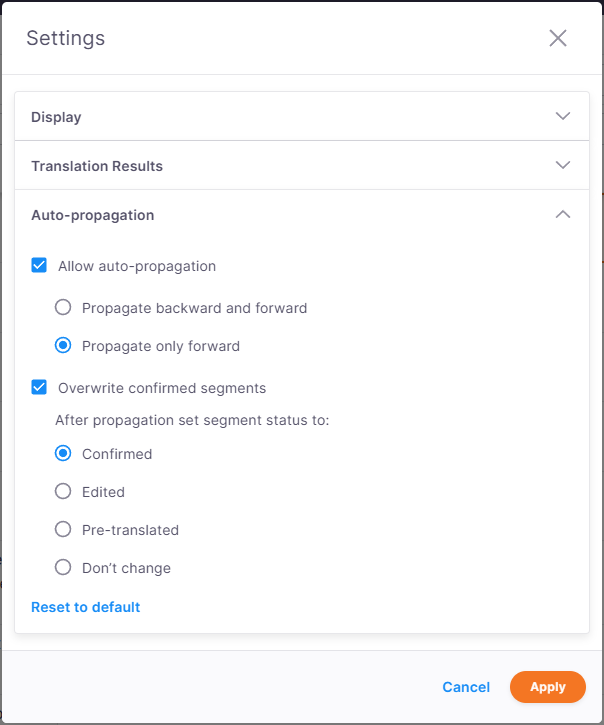 Lassen Sie das Kontrollkästchen Auto-Propagation aktiviert, um bestätigte Übersetzungen automatisch auf wiederholte Segmente im Dokument oder in der aktuellen Ansicht anzuwenden.