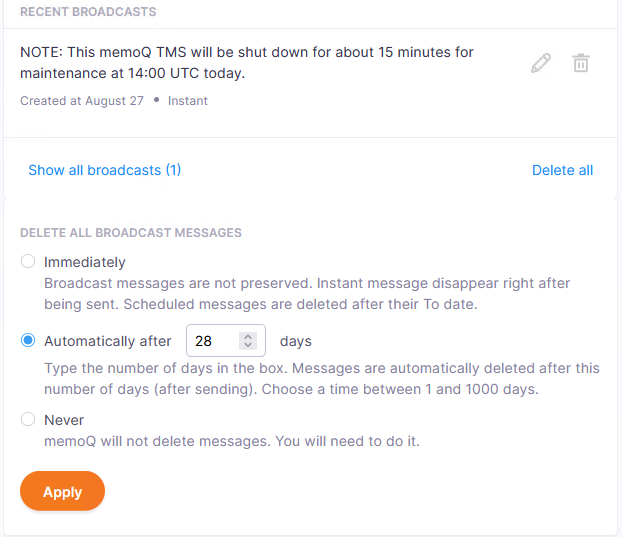 So teilen Sie memoQweb mit, wann Broadcast-Nachrichten gelöscht werden sollen: Wählen Sie unter Alle Broadcast-Nachrichten löschen: