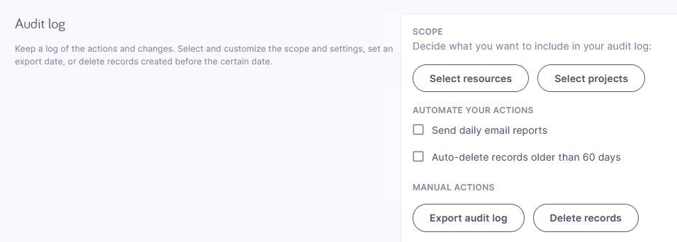 Um Ihr Überwachungsprotokoll kleiner zu halten, aktivieren Sie unter Ihre Aktionen automatisieren das Kontrollkästchen Datensätze, die älter als 60 Tage sind, automatisch löschen. Wählen Sie einen Tag des Monats aus, an dem Sie ältere Datensätze löschen möchten.