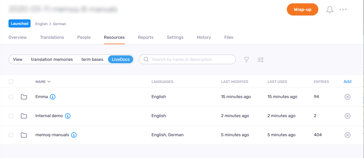 Derzeit ermöglicht memoQweb die grundlegende Verwaltung der am häufigsten verwendeten komplexen Ressourcentypen - Translation Memories, Termdatenbanken und LiveDocs-Korpora.