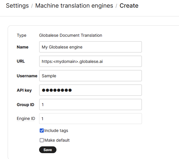 Group ID: the group ID of the engine. The group ID can be retrieved in globalese by memoQ from the engine overview page.