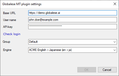 8. Enter the base URL of your globalese by memoQ system, your username and corresponding API key (which can be found in your globalese by memoQ user profile).