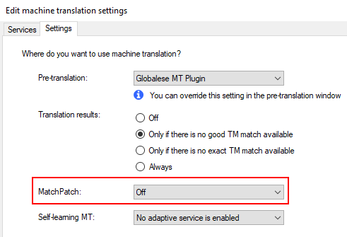 2. MatchPatch must be turned off, otherwise memoQ will instruct the plugin to generate countless tiny jobs that will eventually clog the translation pipeline.