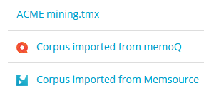 When listing corpora, or displaying the overview of an engine, corpora imported from CAT tool servers will have a small icon next to their name indicating their origin: