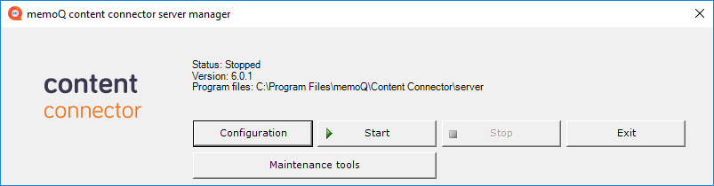 memoQ content connectorサービスを開始するには、Startボタンをクリックします。memoQcontent connectorの初回起動には1分程度かかる場合があります。正常に起動すると、このウィンドウの状況フィールドがRunningに変わり、Startボタンの代わりにStopボタンがアクティブになります: