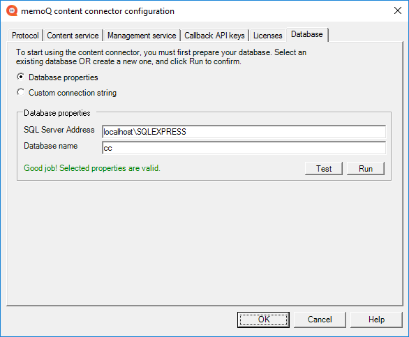 Runボタンをクリックします。memoQ content connector configuration managerは、[cc] データベーススキーマと呼ばれる必要なデータベースオブジェクトを作成します。