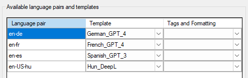 言語ペアごとに、テンプレートを選択し、タグとフォーマットの処理方法を選択します。