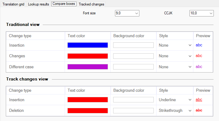 フォントファミリとサイズ:翻訳エディタ、整合エディタ、およびライブ文書エディタのタブにテキストを表示するためのフォントファミリとフォントサイズを選択します。これはアルファベット言語に当てはまります。