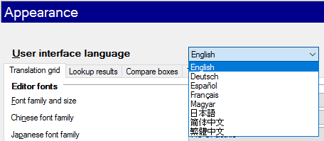 memoQの言語を変更:ユーザーインタフェースの言語ドロップダウンボックスから別の言語を選択します。