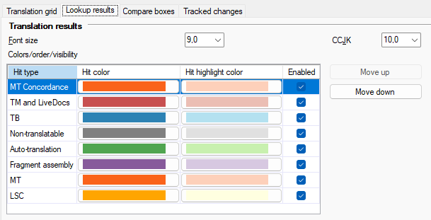 各スキームでは、memoQで異なる色の組み合わせを定義できます。デフォルトでは、翻訳結果の各ヒットの種類の元の色 (TM、ライブ文書、TB、翻訳対象外など) を保持していますが、必要に応じて変更できます。