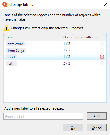 このウィンドウでは、選択された正規表現のラベルと、そのラベルを持つ選択された正規表現の数が表示されます。たとえば、上のイメージでは:
