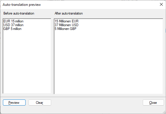 次に、自動翻訳ルールタブで正規表現(#currency#) (\d{1,}) million ((EUR|USD|GBP) (\d{1,}) millionと同じ) と置換式$2 Millionen $1を作成します。上記の正規表現と置換式のプレビューは次のようになります: