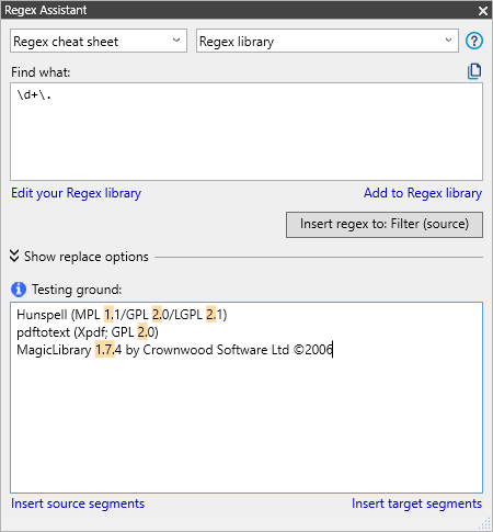 正規表現アシスタントにはまさにテストの場所があります。テスティンググラウンドテキストボックスにテキストをコピーして貼り付け、次を検索ボックスに正規表現を入力します。memoQは、正規表現に一致するテキスト部分をハイライト表示します:
