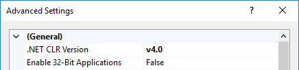 IIS Managerプログラムを開きます (Windows StartメニューまたはStart画面で、inetmgrと入力し、Enterを押します)。左側で、サーバー名を展開し、Application poolsをクリックします。使用するアプリケーションプールをクリックします。(サーバ上で他のWebベースアプリケーションを実行する予定がない場合は、Default application poolを使用できます。)右側のペインで、Advanced settingsをクリックします。最初の2つの項目を次のように変更し、OKをクリックします。