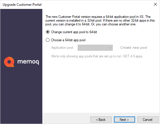 バージョン9.0以降、memoQおよびmemoQ TMSは64ビットのみです。このため、customer portalのIISアプリケーションプールを64ビットに変更する必要があります。アップグレードを開始すると、次のウィンドウが開きます: