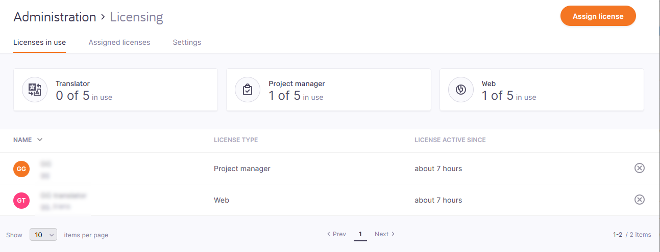 タイルには、プロジェクト管理者ライセンス1つとWebライセンス1つが使用中であることも示されています。リストには、以下が表示されます: