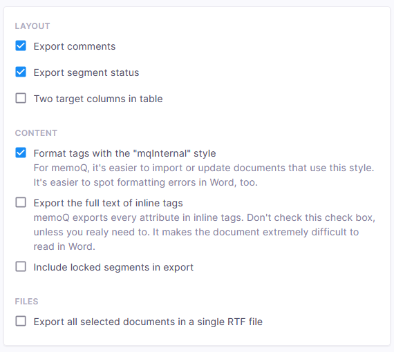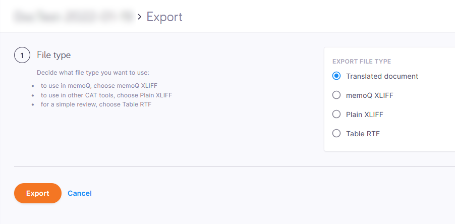 ファイルの種類セクションで、形式を選択します。元の形式(翻訳済み文書)またはプレーンXLIFFを選択した場合、memoQwebはドキュメントをZIPファイルに保存します。それ以外の場合は、設定セクションが開きます。