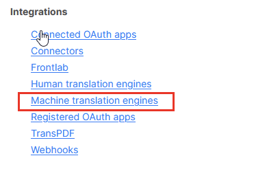 In Phrase, choose Settings → Integrations → Machine translation engines
