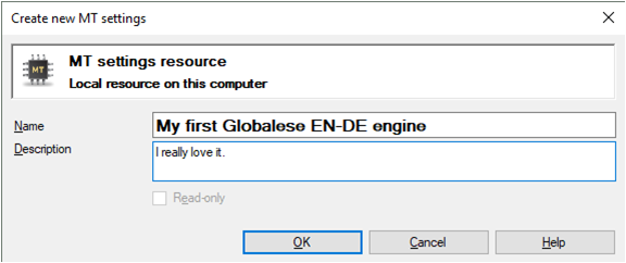 3. Enter a meaningful name for the engine. We suggest you include the language pair in the name (you’ll thank yourself later).