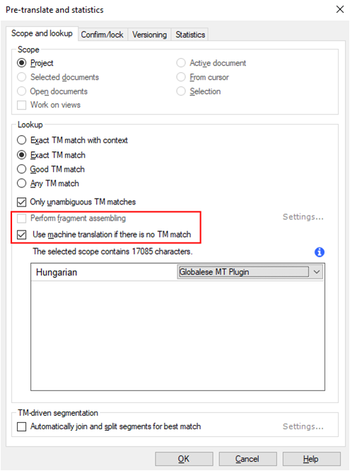 Make sure the Perform fragment assembling option is unchecked, and check the Use machine translation if there’s no TM match option.