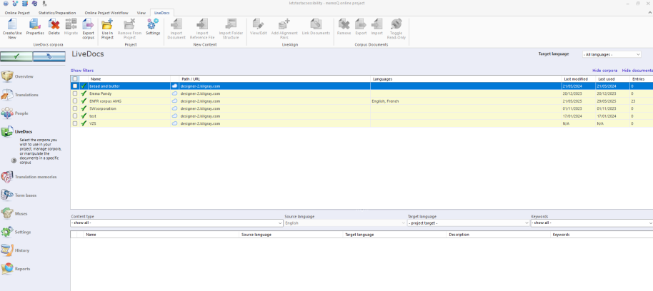 After creating a new corpus, memoQ takes you back to the LiveDocs page. This window has two main sections:
